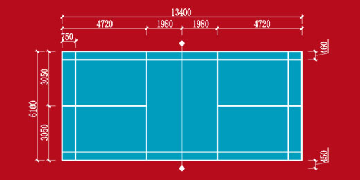羽毛球場地是一個(gè)長13.40米,雙打?qū)?.10米,單打?qū)?.18米,場地中央被球網(wǎng)(兩邊柱子高1.55米,中間網(wǎng)高1.524米)平均分開的長方形場地。